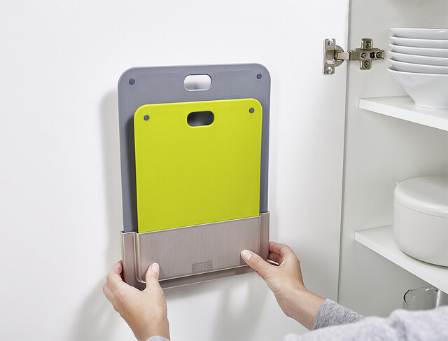 Cette planche à découper ingénieuse ne prend pas de place dans vos armoires car elle se range sur la partie arrière de la porte. Coffre de rangement fin, idéal pour un montage dans des emplacements étroits. Installation simple sans outils grâce au ruban adhésif 3M VHB Planche à découper double face avec pieds antidérapants Surface de coupe structurée adaptée aux couteaux Le kit contient deux planches à découper de tailles différentes et un coffre de rangement fin.